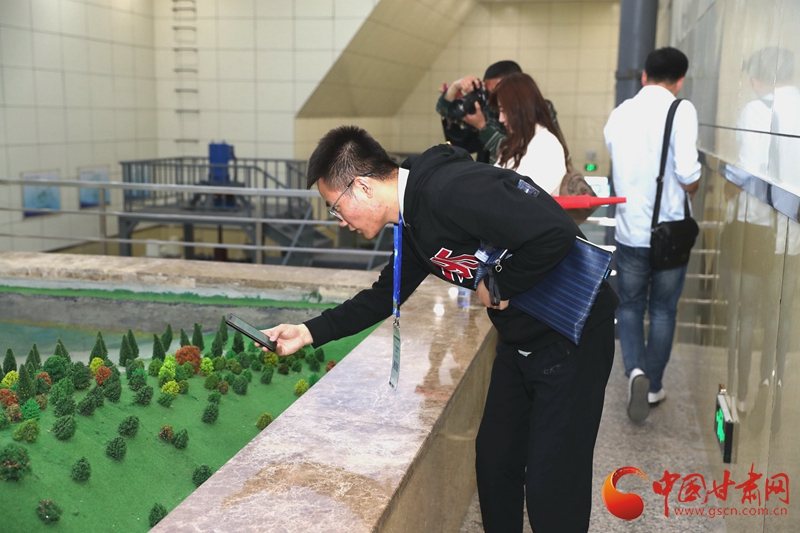 当2019全国主流网络媒体甘肃行记者来到兰州资源环境职业技术学院水利枢纽实训中心,中心内赵剑存老师正在给学生演示如何利用水利枢纽综合智能仿真实训平台对水资源调度过程进行控制。