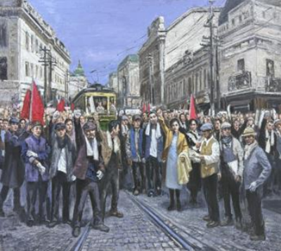 王建国《赵一曼领导哈尔滨电车工人大罢工(1933年)》 油画
