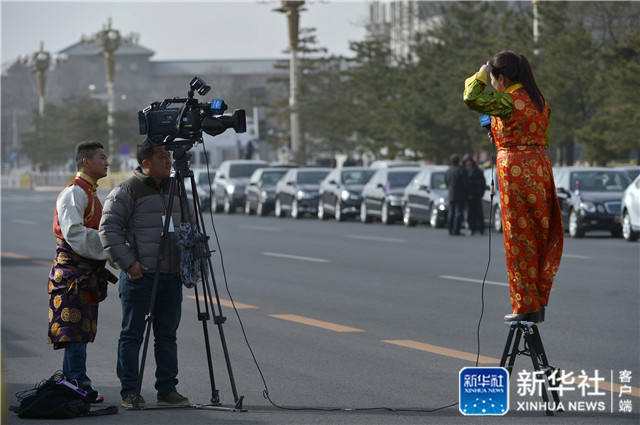 3月5日,第十二届全国人民代表大会第四次会议在北京人民大会堂开幕。这是记者们在人民大会堂外采访拍摄。新华社记者 陈君清 摄