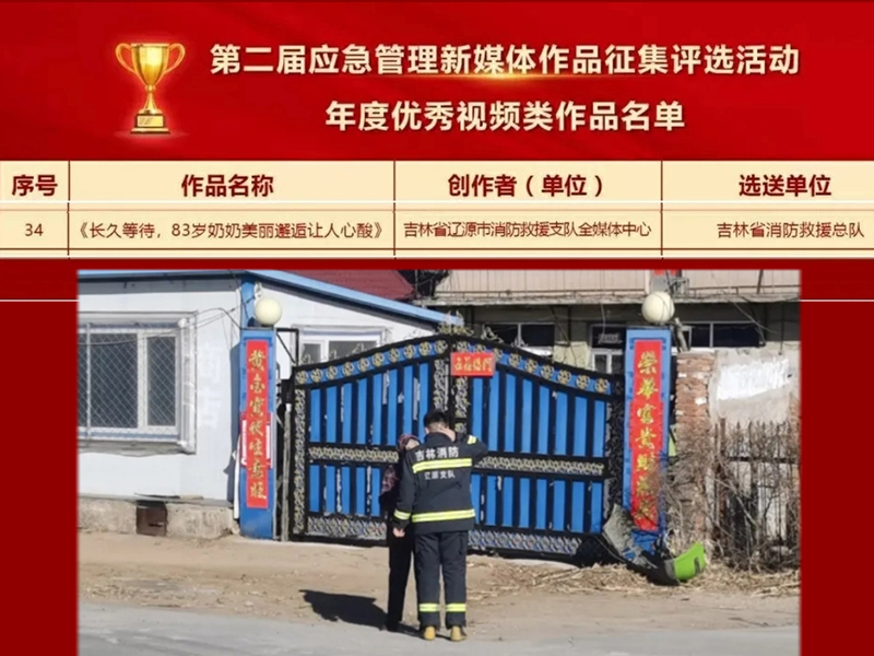 日前,应急管理部公布了《第二届应急管理新媒体作品征集评选活动获奖作品名单》,辽源市消防救援支队新媒体作品《长久等待,83岁奶奶美丽的邂逅让人心酸》获得年度优秀视频类作品。