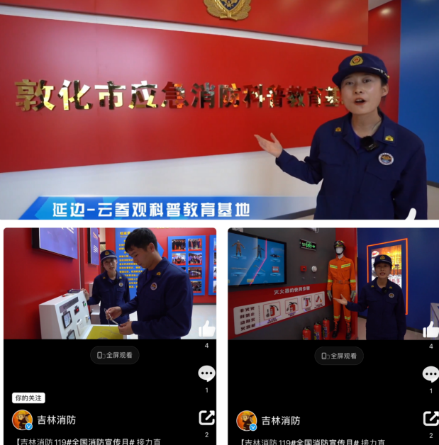 开展“云直播”消防宣传活动。敦化市消防救援大队在应急消防科普教育基地录制了云体验我们的消防科普项目,让大家足不出户就能学习到消防知识。