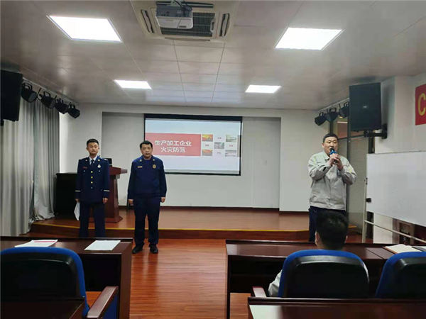 培训会上,首先由大队防火干部王洪刚分析研判当前消防安全形势,对企业进行强调:要提高安全防范意识并加强消防知识的学习,同时详细解读了强令违章冒险作业罪对企业的危害。随后,由大队宣讲团成员王世梁对全体员工进行消防培训,通过观看火灾案例视频,并结合案例视频深入剖析了由于管理制度不落实、防范措施不到位、员工缺少基本扑救知识等问题带来的危害。就重点部位防火、员工逃生自救常识与技能、火灾的预防和扑救初起火灾的基本方法等方面进行了详细的讲解,同时就单位“四个能力”建设内容进行了宣贯。结合企业消防安全现况,进行了有针对性的消防培训,现场指导企业员工如何正确使用室内消防水带和灭火器。