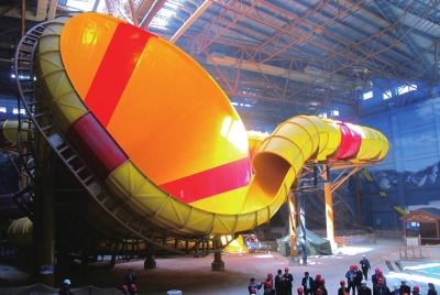 长白山国际度假区南区水乐园项目工地,员工们正紧张地对一处高大建筑物进行内外装修。穿过焊花闪闪的门厅,红黄相间的两个大型盘旋式戏水设施矗立在建筑物的中间,工人们正在对其它各式戏水器械进行安装,今年8月即将开业,对于眼前的一大摊子活计,大可不必怀疑万达的速度。