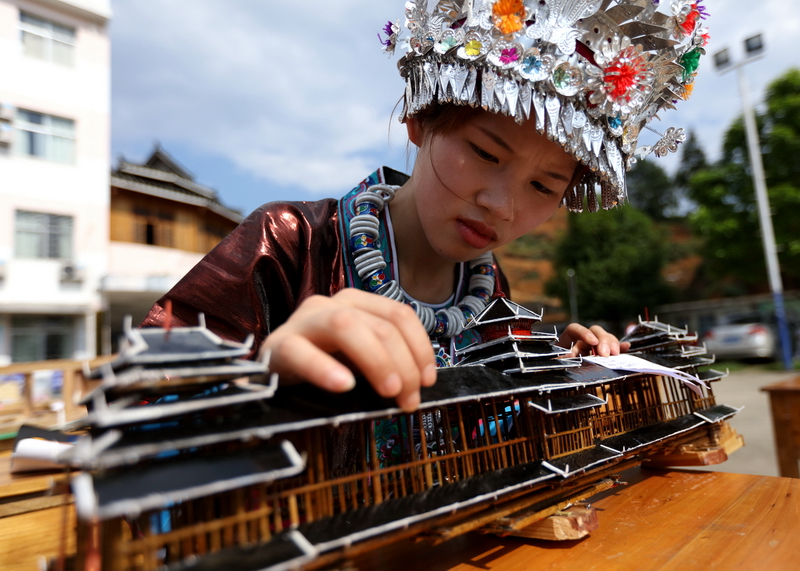 5月31,学生在广西柳州三江侗族自治县实验学校首届民族文化艺术节上展示风雨桥模型。(吴练勋 摄)