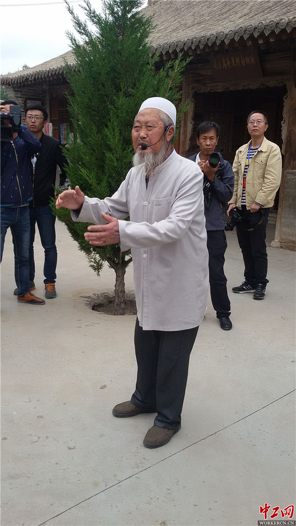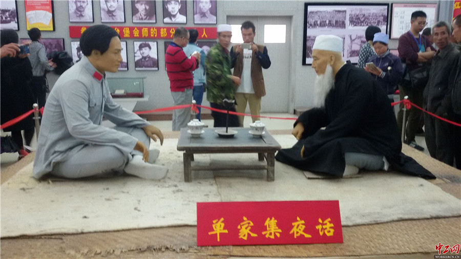 家集75岁的解说员拜富贵为记者们讲解红军长征夜宿单家集,受到当地群众热情招待,毛主席与阿訇长谈的历史。