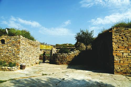 堡里的房子大多没有人居住,各家院里杂草丛生。其实,整个老牛湾堡就是建在巨大的石头崖顶,所以房子多是就地取材,用石块垒墙,用石板盖顶,屋里的地面不用铺砖,就是原来的石头地面。插旗杆的石墩、舂米的石臼、碾米的石碾、存粮的石仓,石头在这里可谓用尽其材。远远望去,老树包围的整个堡子充满了沧桑感。